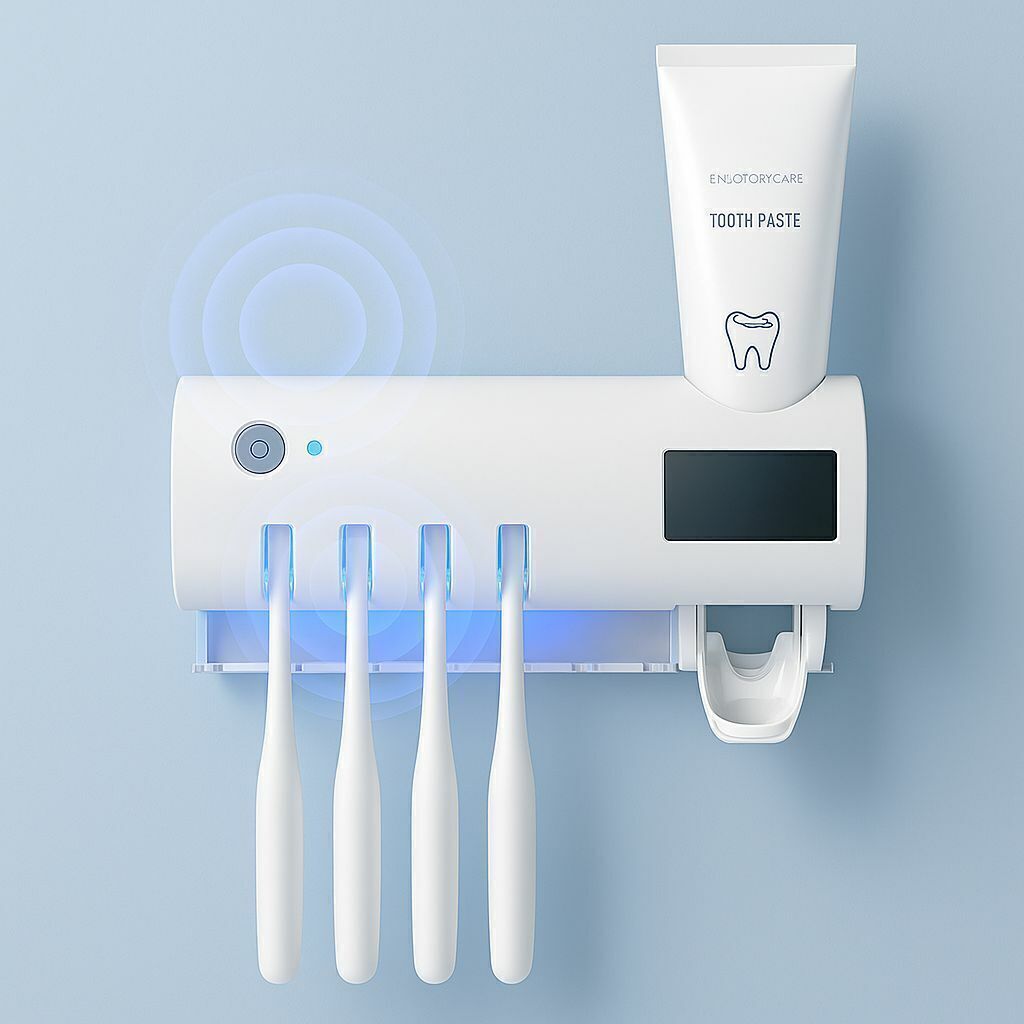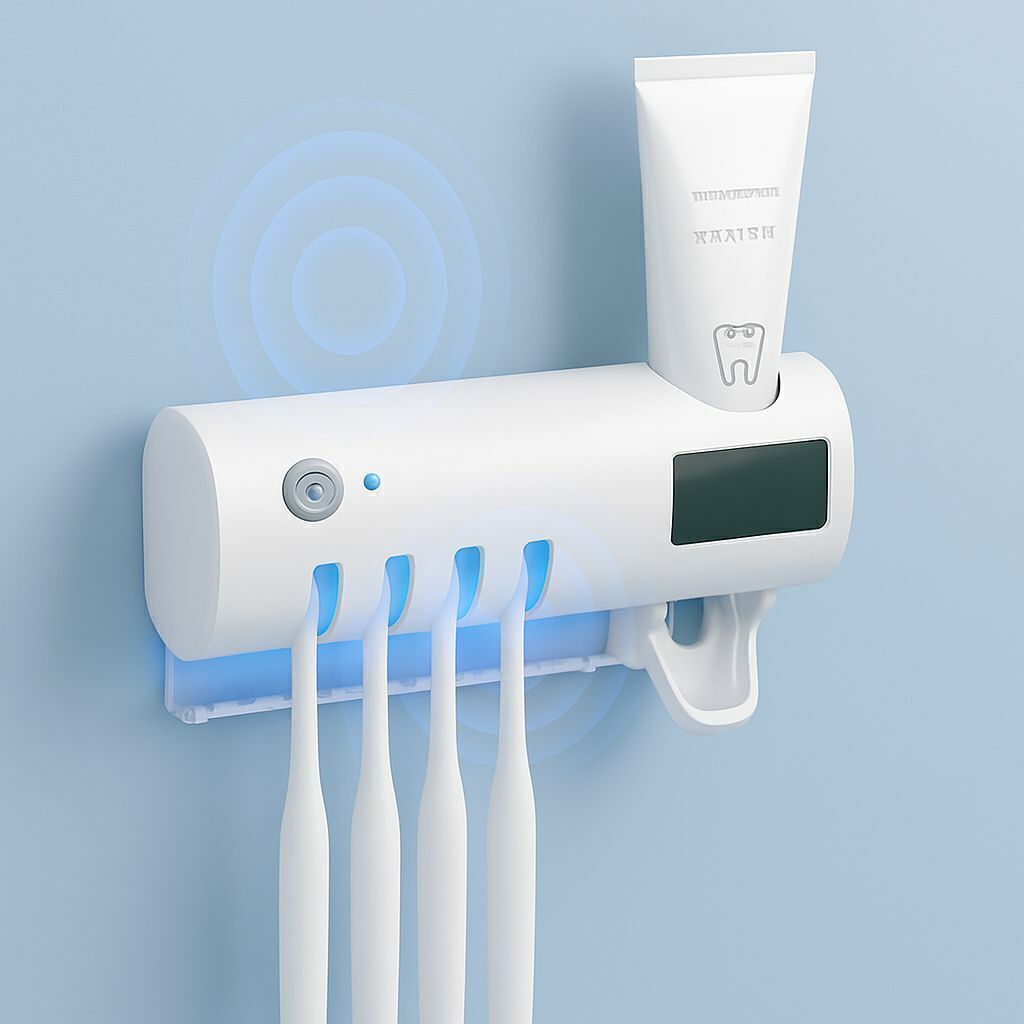 Esterilizador com luzes ultravioletas eliminando 99% de germes e bactérias diretamente da escova de dentes.
