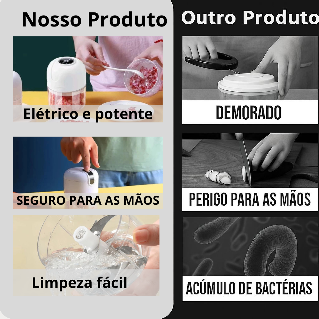 Já pensou fatiar uma cebola inteira em apenas poucos segundos? Ele tritura muito rápido, substituindo sua tábua e faca de cortar, assim você poupa tempo na cozinha e torna todo o processo mais prático.