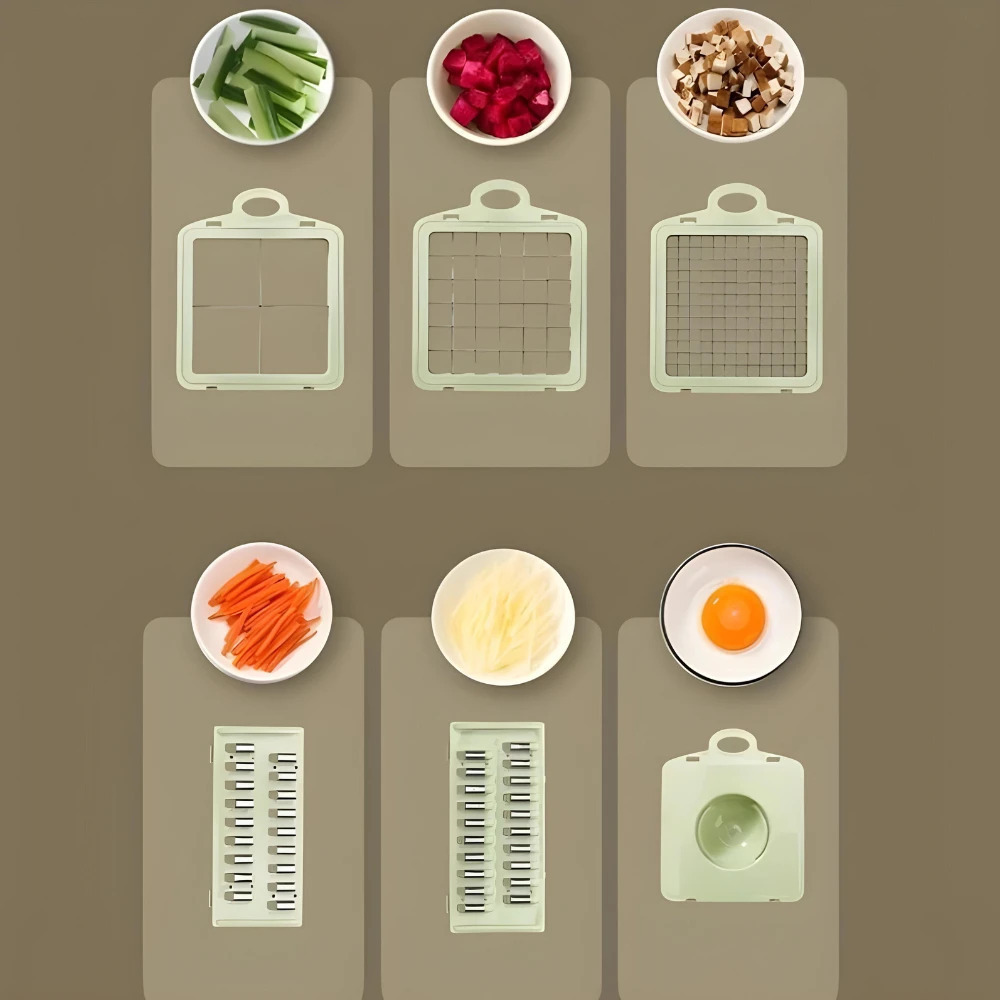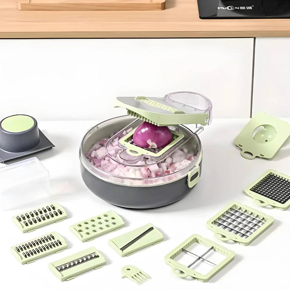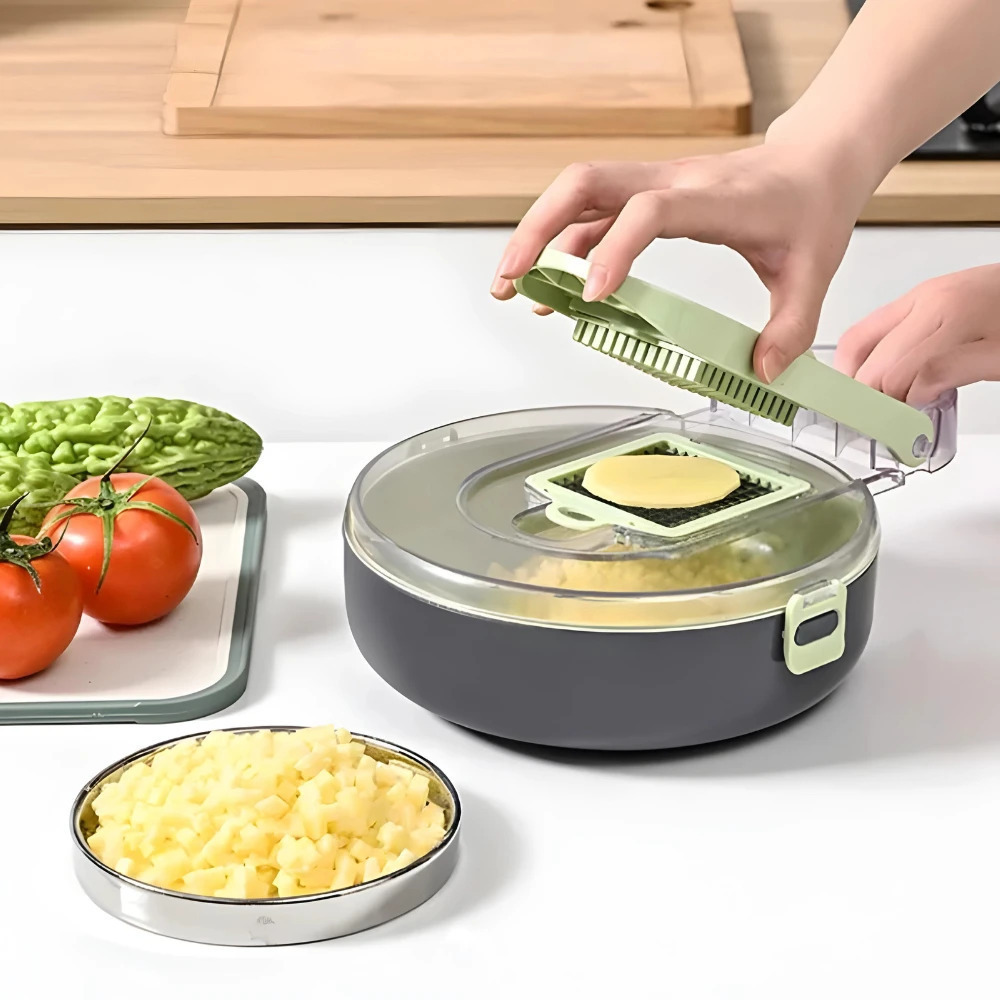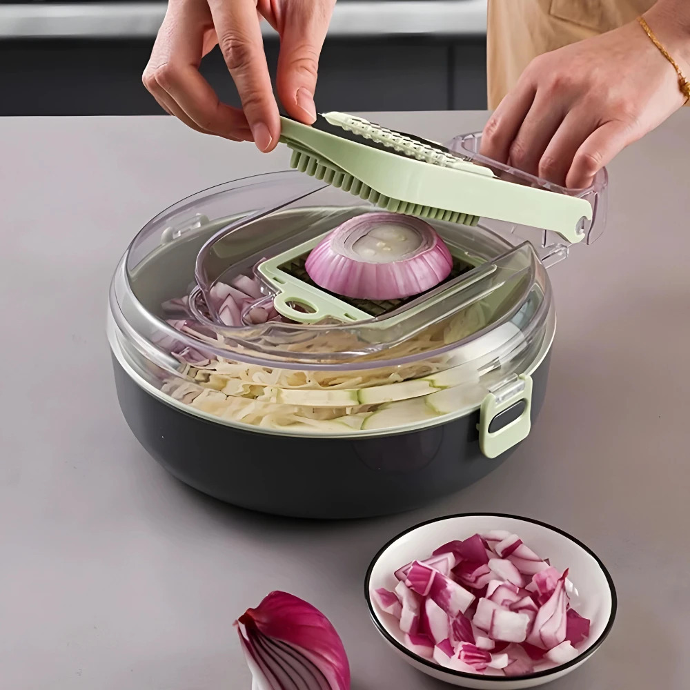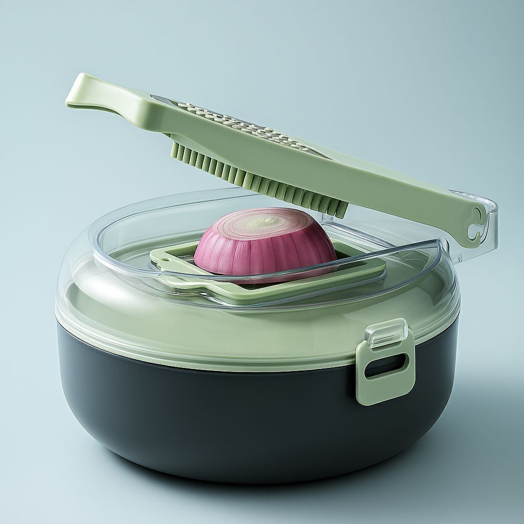 * Economize tempo e energia com no cortador de cebola e vegetais que corta diferentes batata, cebola, pepino e muito mais com facilidade. Vem com uma variedade de lâminas e um recipiente para armazenar seus produtos fatiados.